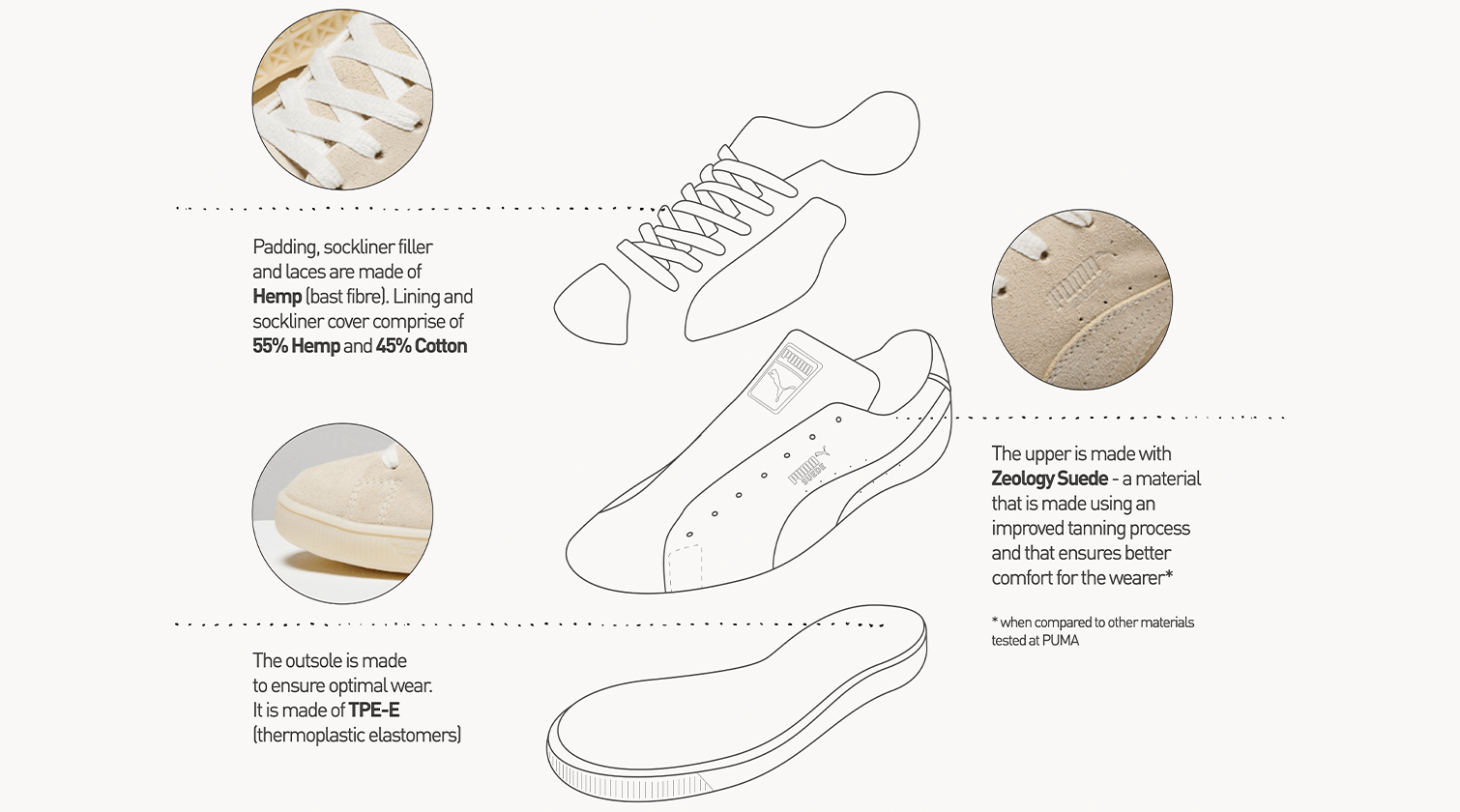 In 2021, we created 500 pairs of the experimental RE:SUEDE, using Zeology tanned suede, a Thermoplastic Rubber (TPR) outsole and hemp fibres. The RE:SUEDEs were worn for half a year by volunteers in Germany to test the comfort and durability of the shoes before we sent them to a specially equipped industrial composting area operated by our partner Ortessa Group in the Netherlands.