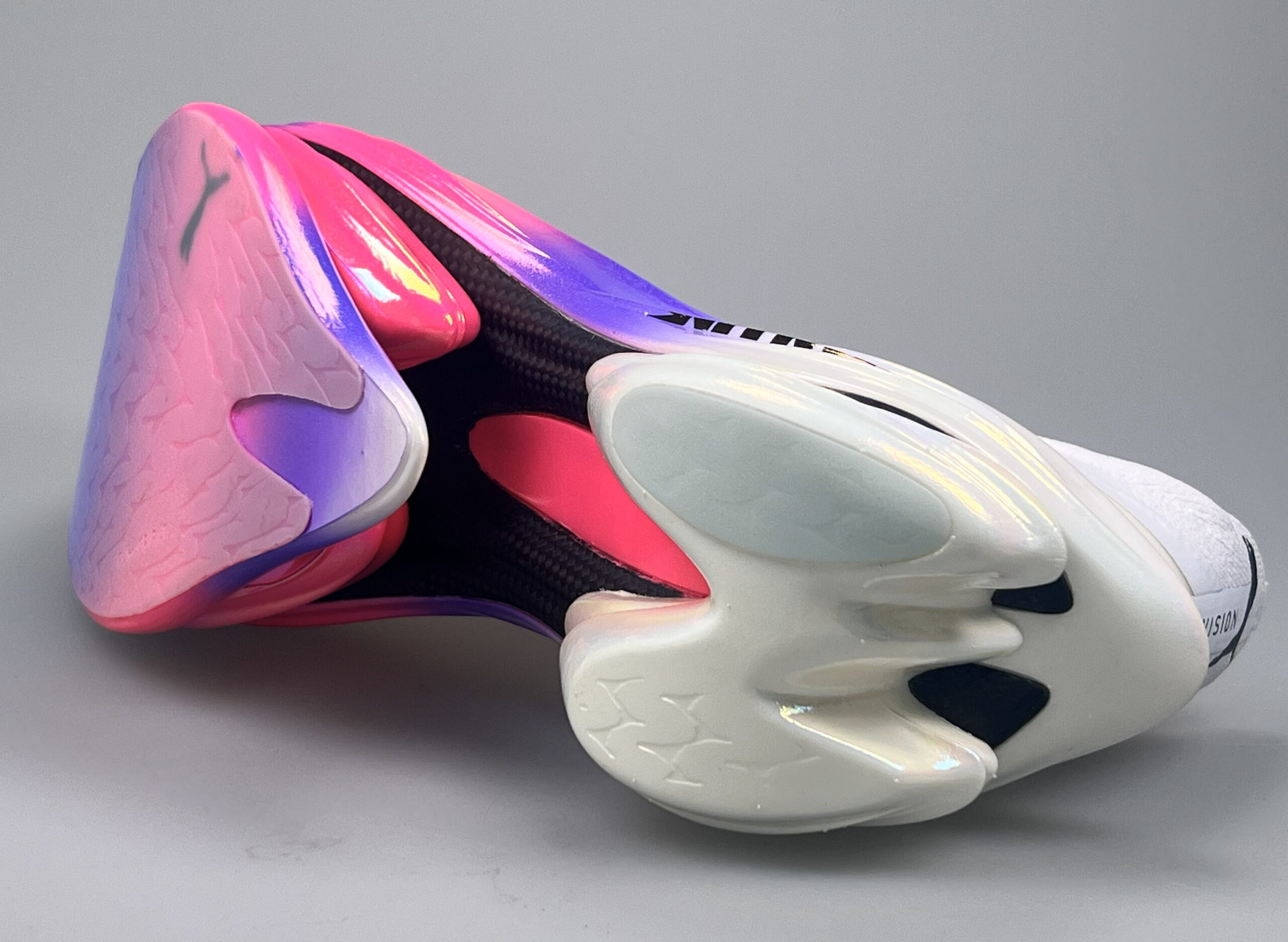 PUMA gehörte zu den ersten Sportmarken, die dieses Potenzial erkannten. Bereits 2006 integrierte das Unternehmen eine Carbonplatte in den Fußballschuh v1.06 – lange bevor Carbon als Leistungsmotor im Laufsport diskutiert wurde. Damals ging es nicht um Rekorde. Es ging um Gewicht, Stabilität und Druckverteilung. Carbon war das erste Material, das steif genug war, um zusätzlichen Halt zu bieten, ohne das Gewicht zu erhöhen. “Carbon bietet das beste Verhältnis von Gewicht zu Steifigkeit. Man kann etwas extrem steif machen, ohne es schwer zu machen”, sagt Hartmann. Für Fußballer bedeutete das mehr Stabilität ohne zusätzliches Gewicht und, was entscheidend ist, eine gleichmäßigere Druckverteilung unter den Stollen. Hartmann fasst es so zusammen: “Man hat nicht mehr das Gefühl, auf einzelnen Punkten zu stehen.”