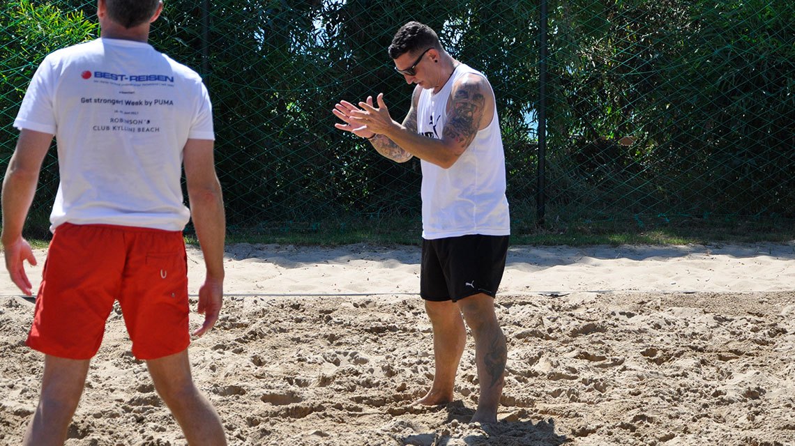 “This is a high-class team,” he praises the three female and two male holiday guests, who fight together with him in Greek afternoon heat of 30 degrees. He constantly applauds dedicated dives, cheers them on to give their best and claps whenever a score is made – even when it is by the opponent team. “Well done”, “a class act”, “terrific”, “super job”, “sensational”, “high five”. And when the ball ends in the net, he stays positive: “Great job, you really tried hard.”