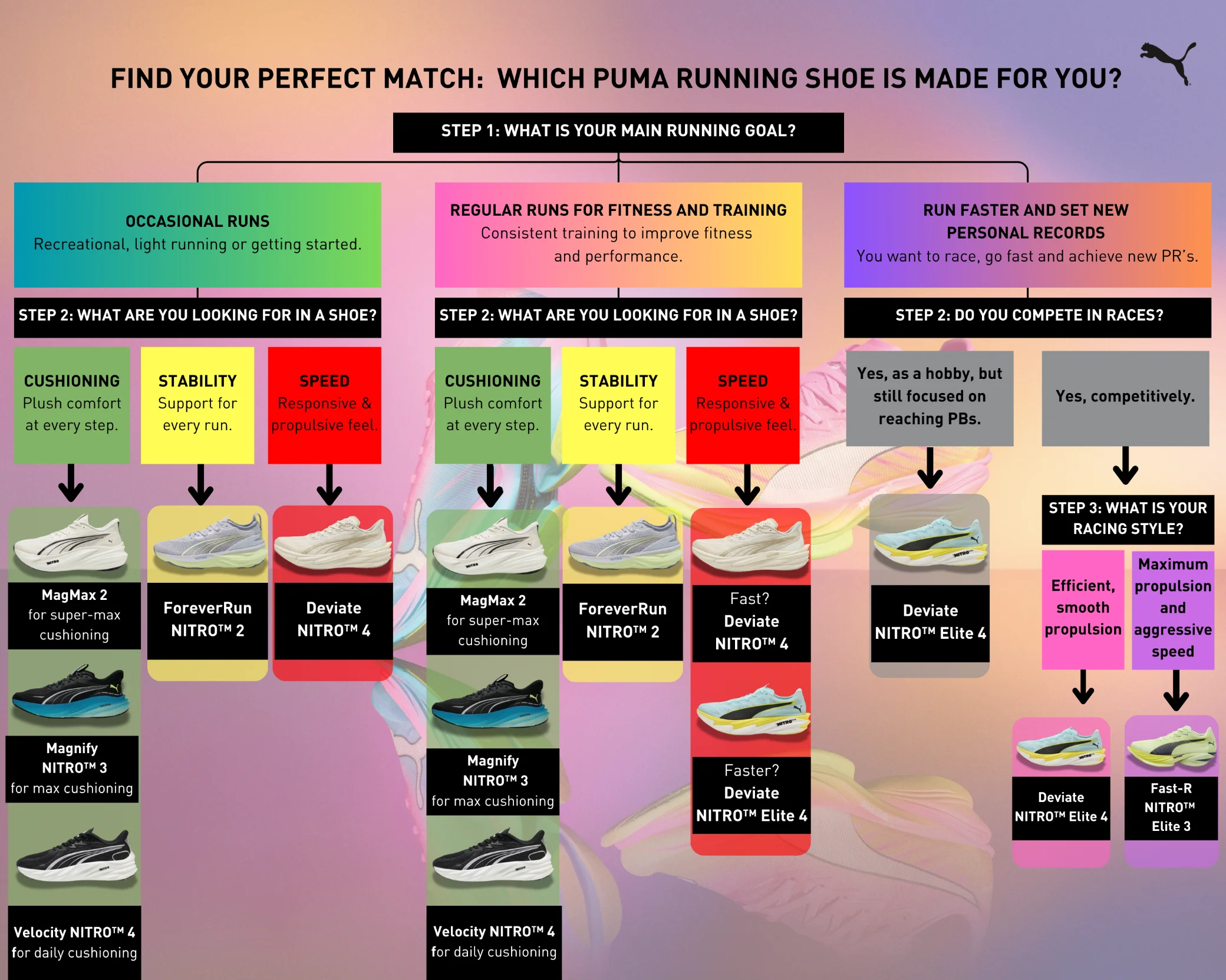 Every runner’s journey is different, but the right shoe can make every step feel more natural, more efficient, and more enjoyable. Whether you are building your base, preparing for marathon day, or chasing a new personal best, there is a perfect match waiting for you within the PUMA running range.Happy running!