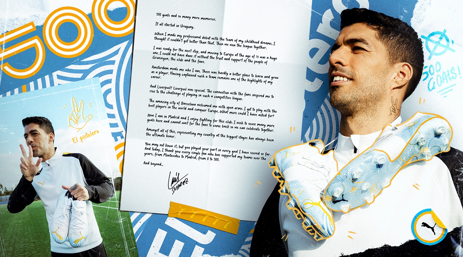 To celebrate Luis’s milestone achievement PUMA has also produced a special-edition 500 goal FUTURE Z football boot. The next-gen FUTURE Z features a striking design inspired by Luis’s proud Uruguayan heritage. The heel of the boot features a 500 goal motif with Luis’s famous ‘El Pistolero’ logo displayed across the medial side. Targets are showcased across the upper to signify Luis hitting the target 500 times and integrated into the footbed of the boot are the colors of each of the teams Luis has represented throughout his career.