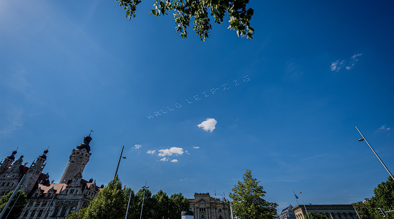 Weather-wise, it was a day to frame for summer-loving Leipzigers. Tuesday afternoon we sent, together with the Champions League team, four clearly legible Skytext messages to the people of Leipzig from an altitude of around three kilometers: “Hello Leipzig” could be read first, followed by the date “11.07. 2024” and “UnstoppRBL“, and finally the somewhat more specific message “PUMA x RB Leipzig“. The celestial messages were written in the sky by aerobatic pilots using environmentally friendly kerosene oil, which evaporates without leaving any residue.