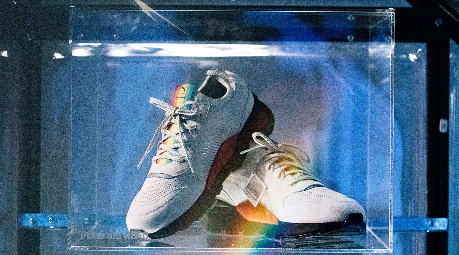 The RS-0 Polaroid sneaker is inspired by the game-changing Polaroid OneStep instant camera with reflective laces and the iconic Polaroid Color Spectrum graphic on the heel.