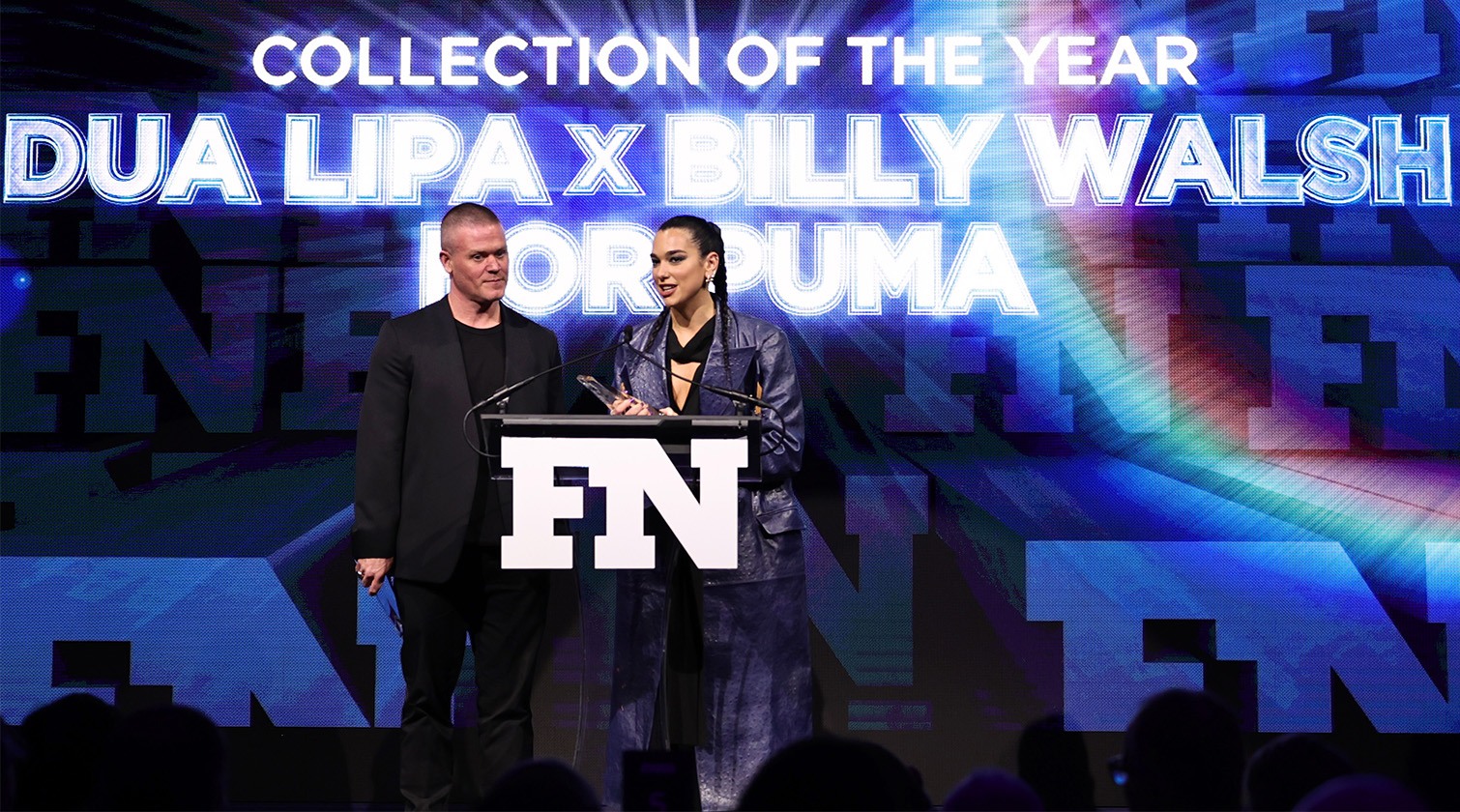 Dua Lipa and Billy Walsh accept the Collection of the Year Award for “PUMA x Dua Lipa Flutur Drop 2” onstage during the 2022 Footwear News Achievement Awards on November 30, 2022 in New York City.